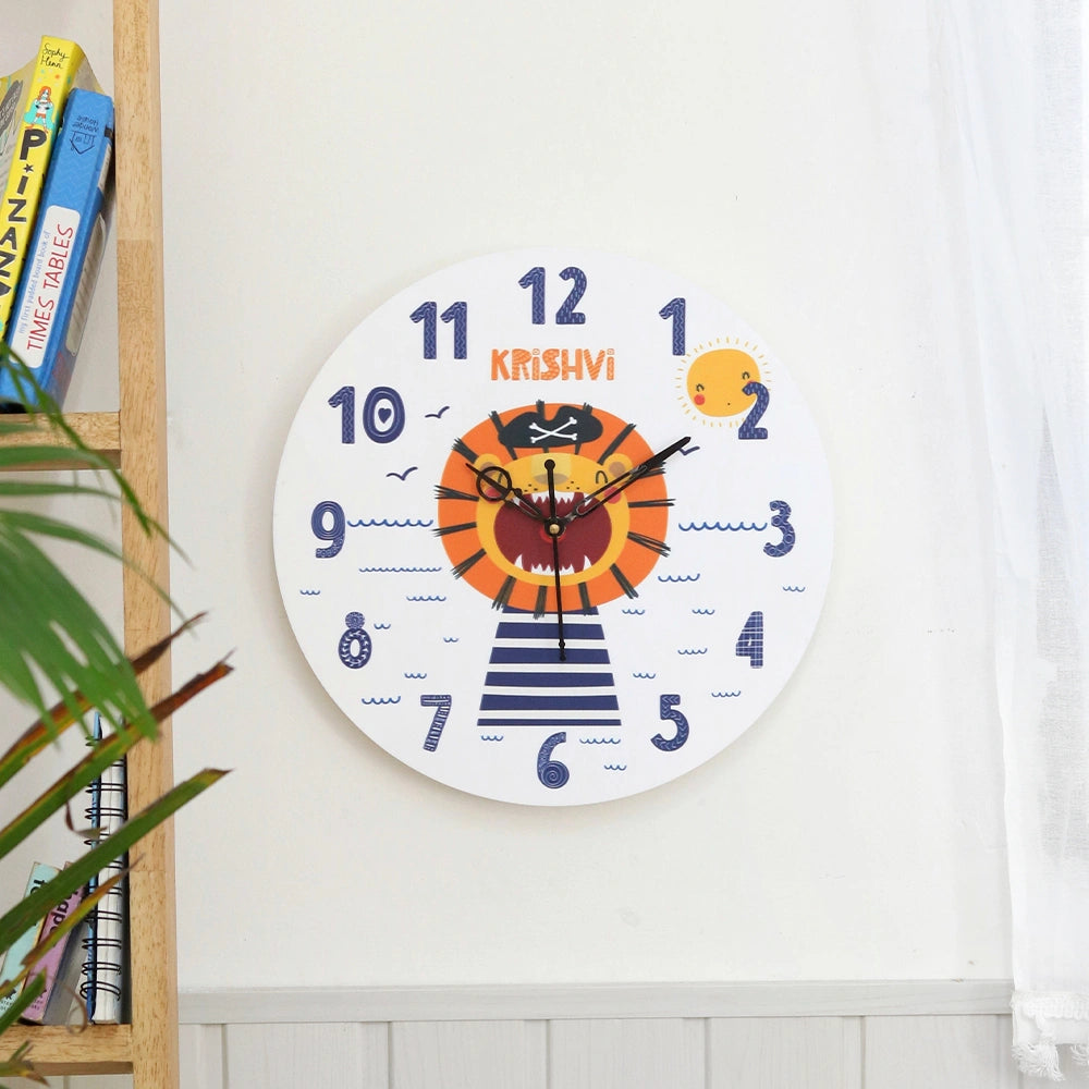 This is a collection of decorative wall clocks primarily designed for children's rooms. Each clock features a round, white face with clear, large numerals and different colorful, child-friendly themes and characters. Several of the clocks also feature customization with a child's name. The overall aesthetic is bright, playful, and engaging for kids.