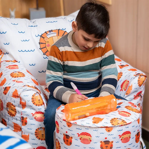 bean bag features bright and cheerful designs that add a fun and lively touch to any room. Its colorful appearance creates a joyful and inviting space for children to relax and play.