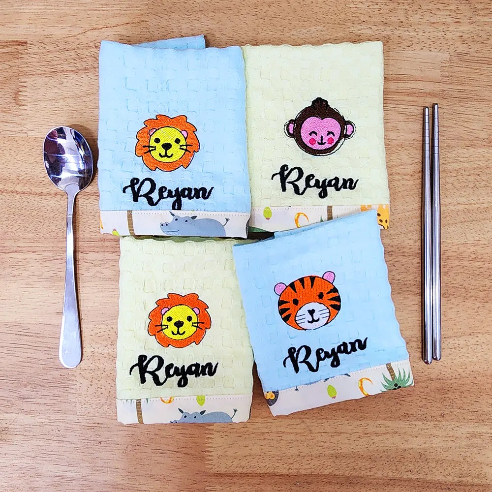 Napkin set is soft, absorbent, and durable — perfect for mealtime, travel, or daycare use.