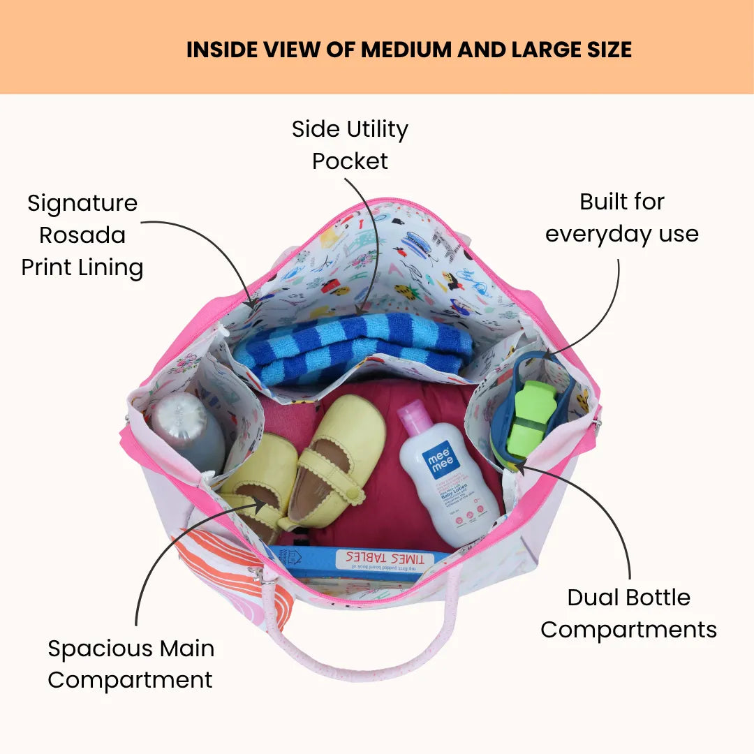 Equipped with one main compartment and three side sections, with ample space for carrying snacks, books, toys, and other essentials, making it ideal for outings.