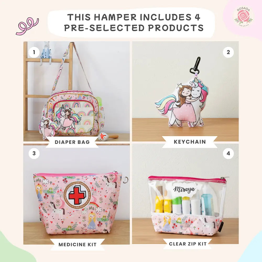 This beautifully designed baby essentials hamper includes 5 pre-selected products, thoughtfully curated to support parents on the go. It features a spacious and stylish diaper bag with organized compartments to store all baby necessities with ease. An adorable butterfly keychain adds a playful and personalized touch. The hamper also includes a handy medicine kit for keeping baby health essentials neatly organized, along with a clear zip kit that makes it easy to store and quickly access toiletries or daily-use items. Designed in soft pastel tones with charming prints, this hamper is both practical and visually appealing—making it an ideal gift for newborns, baby showers, or new parents.