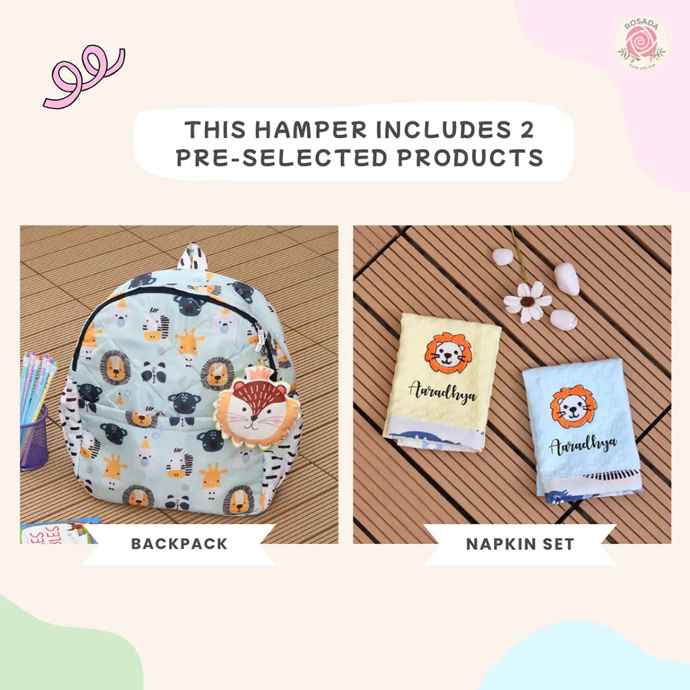 This set includes one medium backpack, two soft cotton napkins, and a complimentary gift card. Its kid-friendly design makes it suitable for both school and travel. High-quality zippers and strong stitching ensure long-lasting performance, while the easy-care fabric allows quick cleaning and effortless maintenance. A perfect choice for birthdays, school openings, and special gifting occasions.