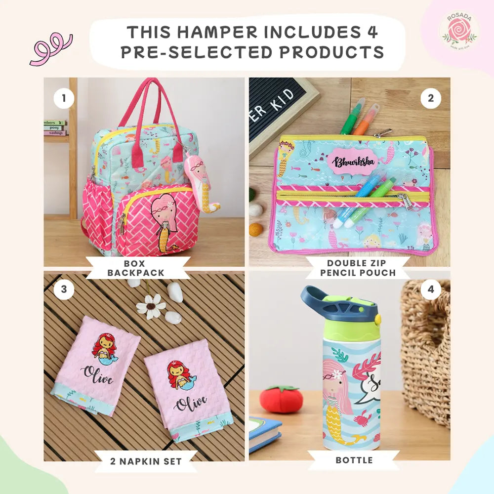 Hamper includes 4 thoughtfully selected essentials designed for school and everyday use. It features a spacious box backpack with playful sports-themed prints, offering comfortable carrying and ample storage for books and supplies. The double-zip pencil pouch keeps stationery neatly organized and easily accessible. A soft and reusable 2-napkin set adds everyday convenience, while the durable water bottle ensures kids stay hydrated on the go. Finished in cheerful colours with personalized detailing, this hamper is a perfect blend of fun, functionality, and practicality—making it an ideal gift for school starters, birthdays, or special occasions.
