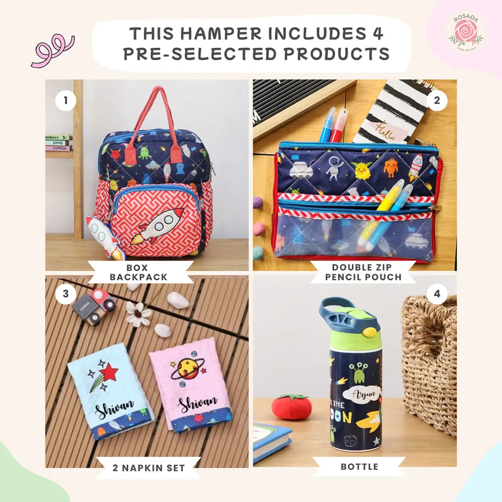 Hamper includes 4 thoughtfully selected essentials designed for school and everyday use. It features a spacious box backpack with playful sports-themed prints, offering comfortable carrying and ample storage for books and supplies. The double-zip pencil pouch keeps stationery neatly organized and easily accessible. A soft and reusable 2-napkin set adds everyday convenience, while the durable water bottle ensures kids stay hydrated on the go. Finished in cheerful colours with personalized detailing, this hamper is a perfect blend of fun, functionality, and practicality—making it an ideal gift for school starters, birthdays, or special occasions.