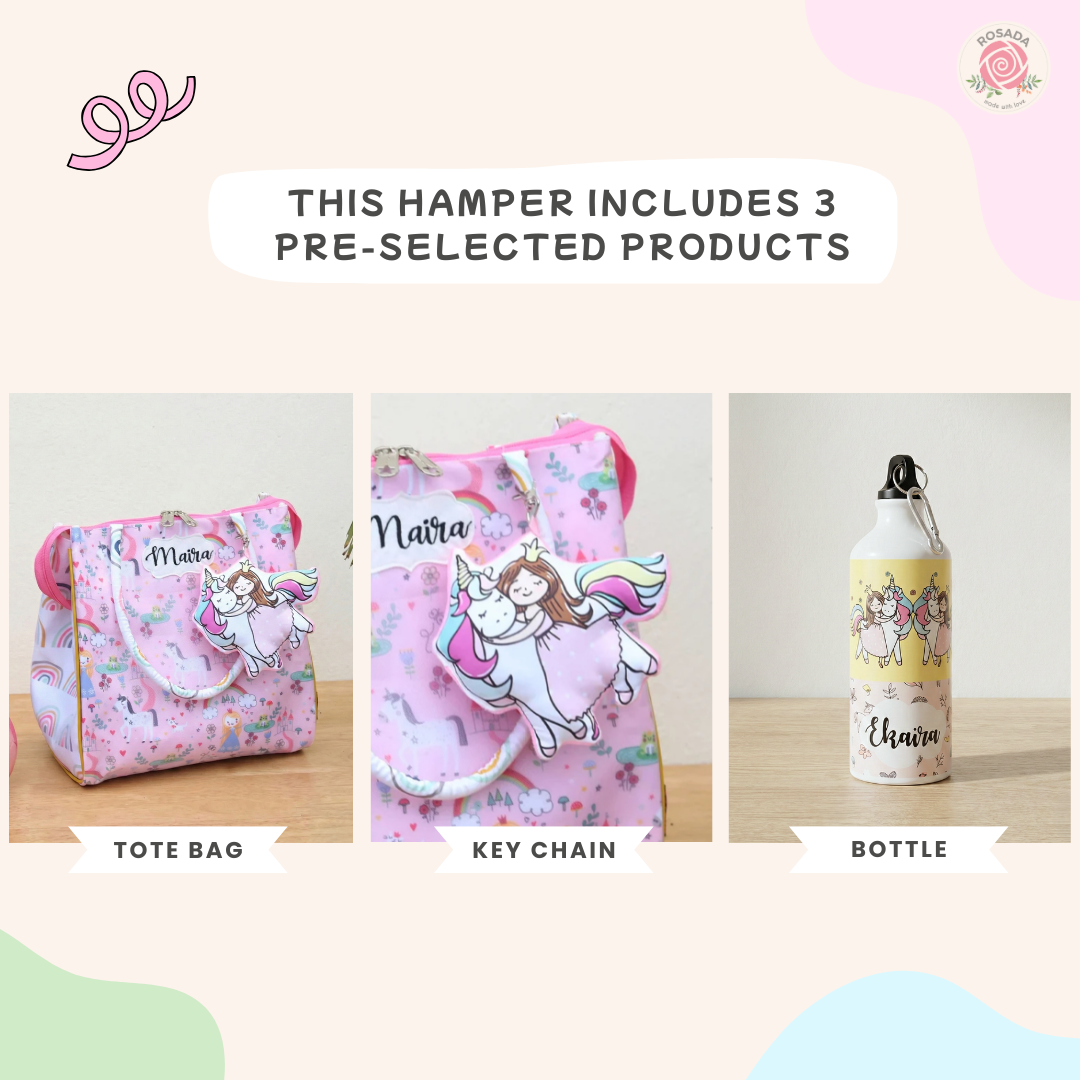 This set features a well-designed medium-size tote bag paired with a personalised bottle, offering a perfect blend of style, utility, and everyday convenience. The tote bag offers ample space for books, lunch, toys, and other essentials, making it an excellent choice for school, outings, and everyday use. Crafted from durable, easy-care fabric, it ensures long-lasting performance while remaining simple to maintain. The personalised bottle adds a special, kid-friendly touch, helping children easily recognise and enjoy using their own bottle. With comfortable handles and a coordinated, attractive look, this set makes a thoughtful, practical, and beautifully designed gifting option for children.
