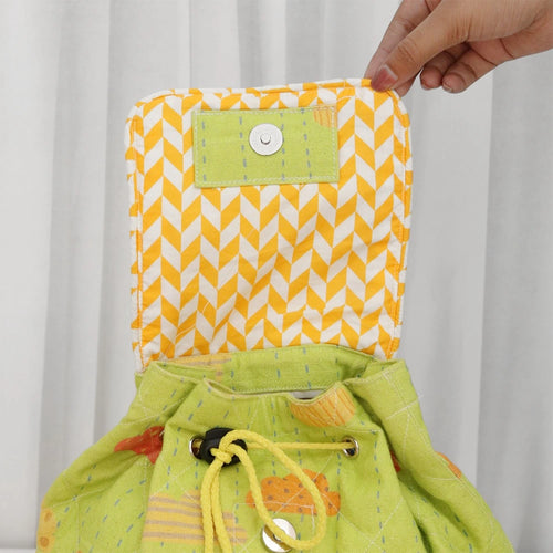 This product has a dual-mechanism closure system, a magnetic snap on the top flap, and a drawstring with a cord lock at the main opening.